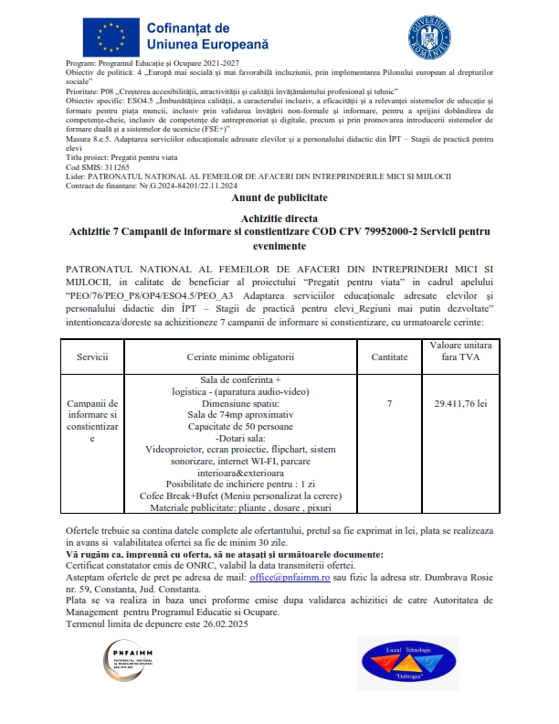 PATRONATUL NATIONAL AL FEMEILOR DE AFACERI DIN INTREPRINDERI MICI SI MIJLOCII, in calitate de beneficiar al proiectului “Pregatit pentru viata” in cadrul apelului “PEO/76/PEO_P8/OP4/ESO4.5/PEO_A3 Adaptarea serviciilor educaționale adresate elevilor și personalului didactic din ÎPT – Stagii de practică pentru elevi_Regiuni mai putin dezvoltate” intentioneaza/doreste sa achizitioneze 7 campanii de informare si constientizare.
