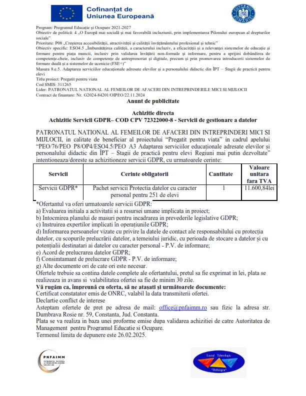 PATRONATUL NATIONAL AL FEMEILOR DE AFACERI DIN INTREPRINDERI MICI SI MIJLOCII, in calitate de beneficiar al proiectului “Pregatit pentru viata” in cadrul apelului “PEO/76/PEO_P8/OP4/ESO4.5/PEO_A3 Adaptarea serviciilor educaționale adresate elevilor și personalului didactic din ÎPT – Stagii de practică pentru elevi_Regiuni mai putin dezvoltate” intentioneaza/doreste sa achizitioneze servicii GDPR.