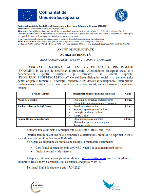 PATRONATUL NATIONAL AL FEMEILOR DE AFACERI DIN IMM-URI (PNFAIMM), în calitate de beneficiar al proiectului „Consolidarea dialogului social și a parteneriatelor pentru ocupare și formare”, în cadrul apelului ”PEO/644/PEO_P1/OP4/ESO4.2/PEO_A7 Consolidarea dialogului social și a parteneriatelor pentru ocupare și formare II – Federații – relansare 2025” dorește să achiziționeze Dotari privind modernizarea spatiilor fizice pentru activitati de dialog social