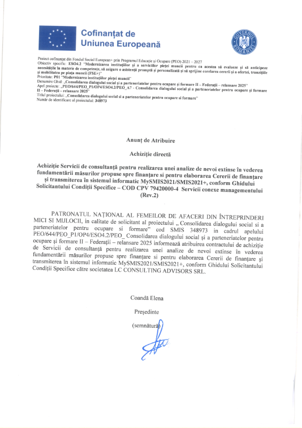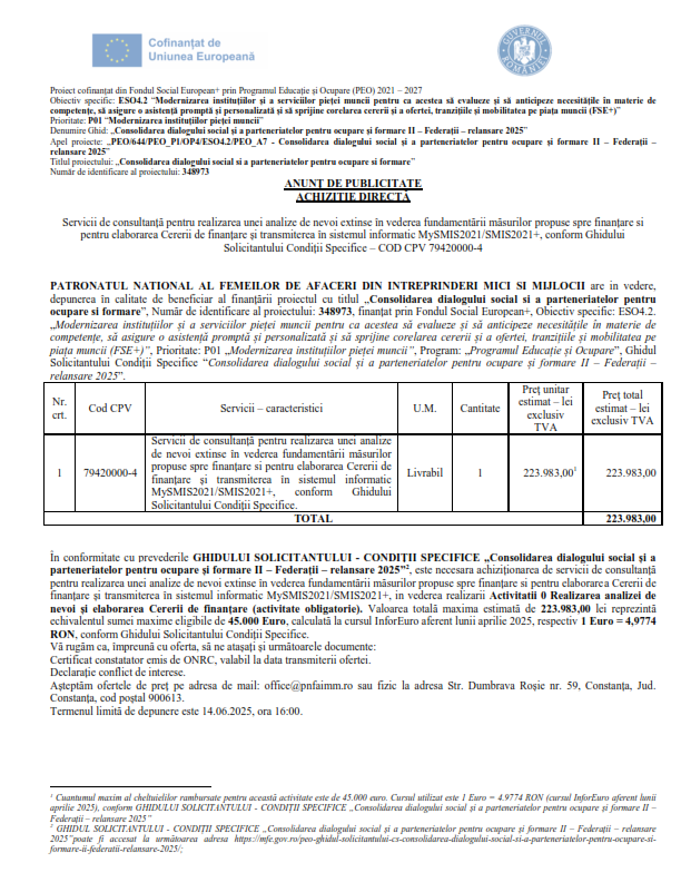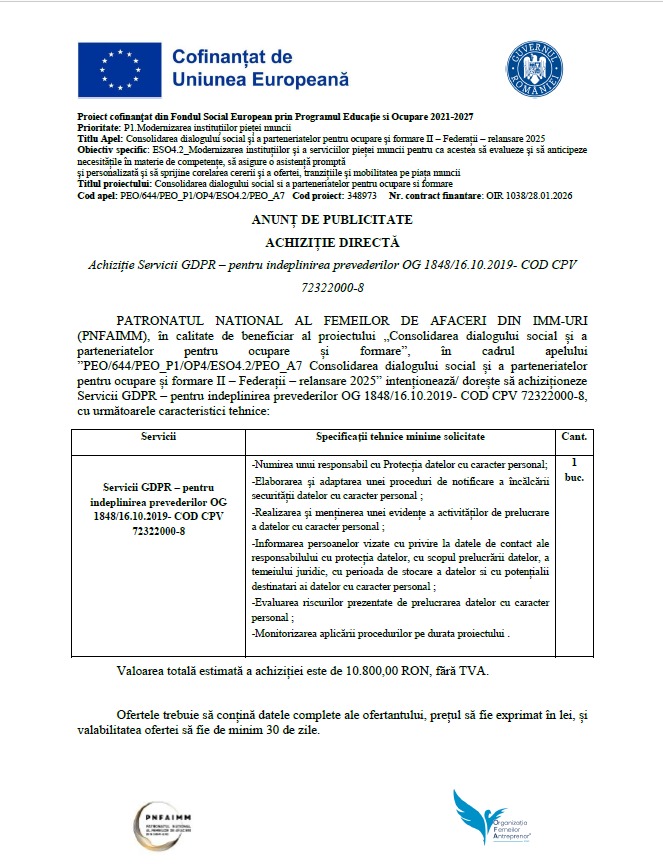 PATRONATUL NATIONAL AL FEMEILOR DE AFACERI DIN IMM-URI (PNFAIMM), în calitate de beneficiar al proiectului „Consolidarea dialogului social și a parteneriatelor pentru ocupare și formare”, în cadrul apelului ”PEO/644/PEO_P1/OP4/ESO4.2/PEO_A7 Consolidarea dialogului social și a parteneriatelor pentru ocupare și formare II – Federații – relansare 2025” intenționează/ dorește să achiziționeze servicii GDPR – pentru indeplinirea prevederilor OG 1848/16.10.2019- COD CPV 72322000-8.