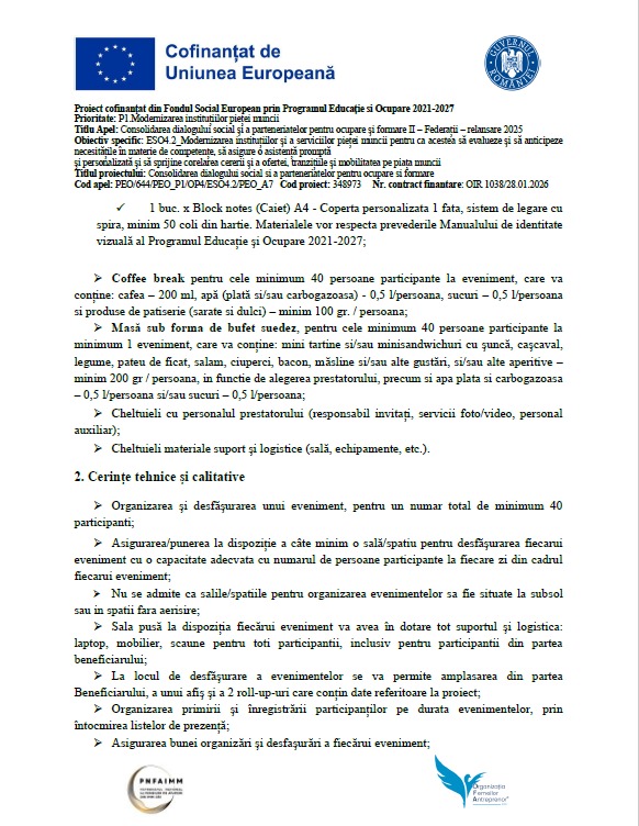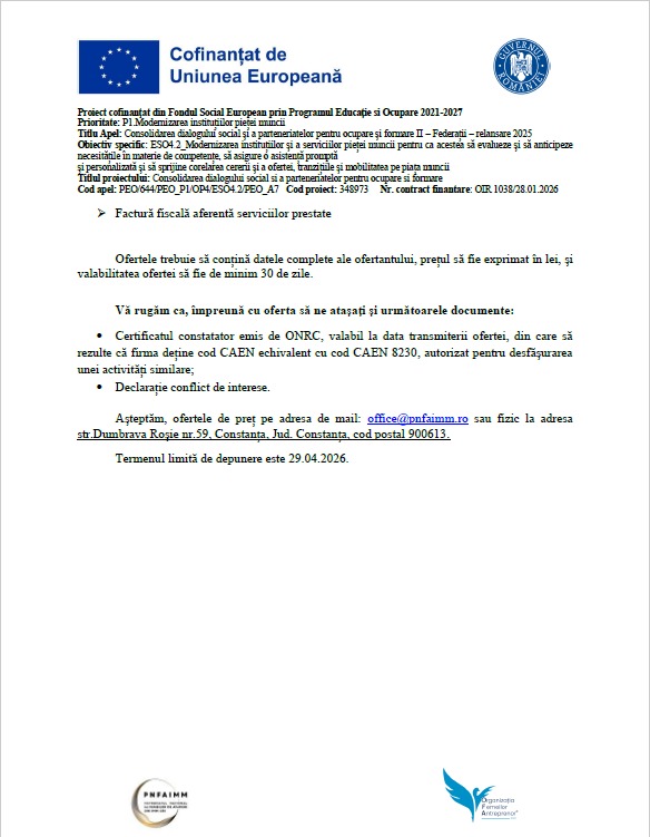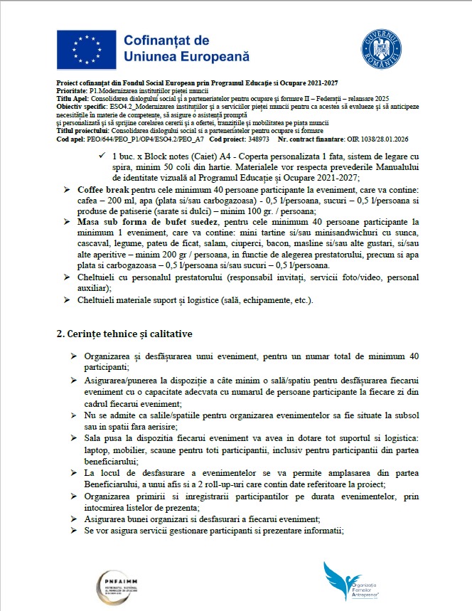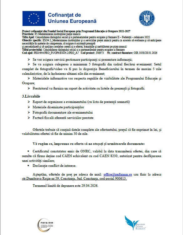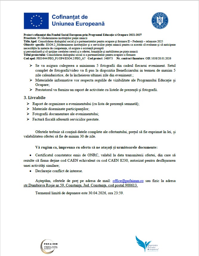 PATRONATUL NATIONAL AL FEMEILOR DE AFACERI DIN IMM-URI (PNFAIMM), în calitate de beneficiar al proiectului „Consolidarea dialogului social și a parteneriatelor pentru ocupare și formare”, în cadrul apelului ”PEO/644/PEO_P1/OP4/ESO4.2/PEO_A7 Consolidarea dialogului social și a parteneriatelor pentru ocupare și formare II – Federații – relansare 2025” intenționează/ dorește să achiziționeze Servicii de organizare evenimente de informare și conștientizare.