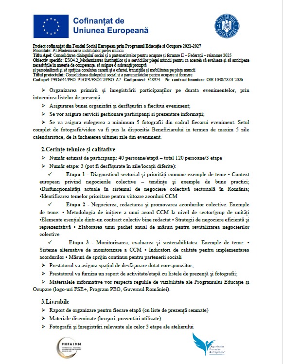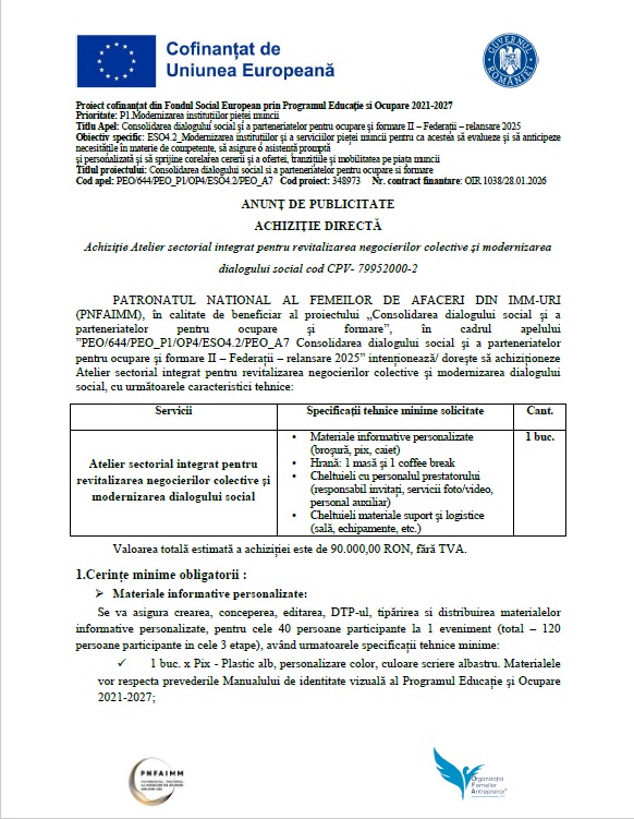 PATRONATUL NATIONAL AL FEMEILOR DE AFACERI DIN IMM-URI (PNFAIMM), în calitate de beneficiar al proiectului „Consolidarea dialogului social și a parteneriatelor pentru ocupare și formare”, în cadrul apelului ”PEO/644/PEO_P1/OP4/ESO4.2/PEO_A7 Consolidarea dialogului social și a parteneriatelor pentru ocupare și formare II – Federații – relansare 2025” intenționează/ dorește să achiziționeze Atelier sectorial integrat pentru revitalizarea negocierilor colective și modernizarea dialogului social.