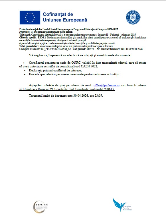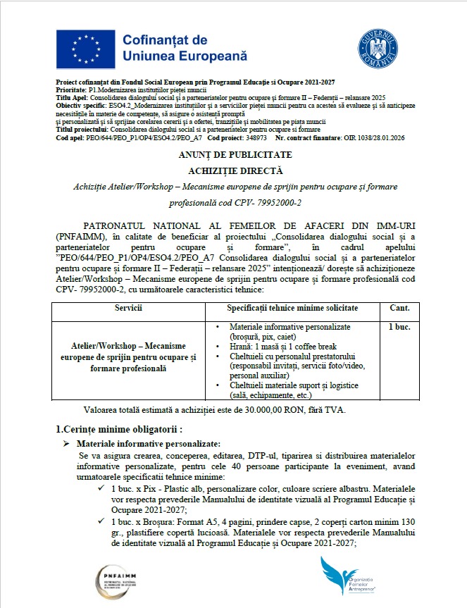 PATRONATUL NATIONAL AL FEMEILOR DE AFACERI DIN IMM-URI (PNFAIMM), în calitate de beneficiar al proiectului „Consolidarea dialogului social și a parteneriatelor pentru ocupare și formare”, în cadrul apelului ”PEO/644/PEO_P1/OP4/ESO4.2/PEO_A7 Consolidarea dialogului social și a parteneriatelor pentru ocupare și formare II – Federații – relansare 2025” intenționează/ dorește să achiziționeze Atelier/Workshop – Mecanisme europene de sprijin pentru ocupare și formare profesională cod CPV- 79952000-2.