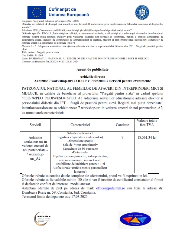 PATRONATUL NATIONAL AL FEMEILOR DE AFACERI DIN INTREPRINDERI MICI SI MIJLOCII, in calitate de beneficiar al proiectului “Pregatit pentru viata” in cadrul apelului “PEO/76/PEO_P8/OP4/ESO4.5/PEO_A3 Adaptarea serviciilor educaționale adresate elevilor și personalului didactic din ÎPT – Stagii de practică pentru elevi_Regiuni mai putin dezvoltate” intentioneaza/doreste sa achizitioneze 7 workshop-uri in vederea creeari de noi parteneriate_A2
