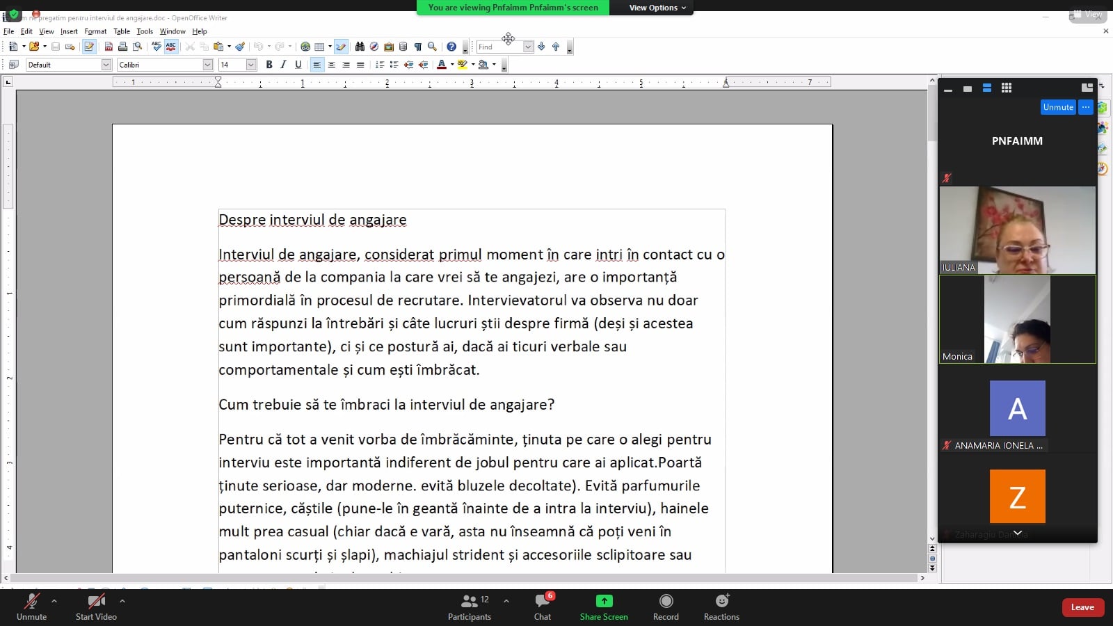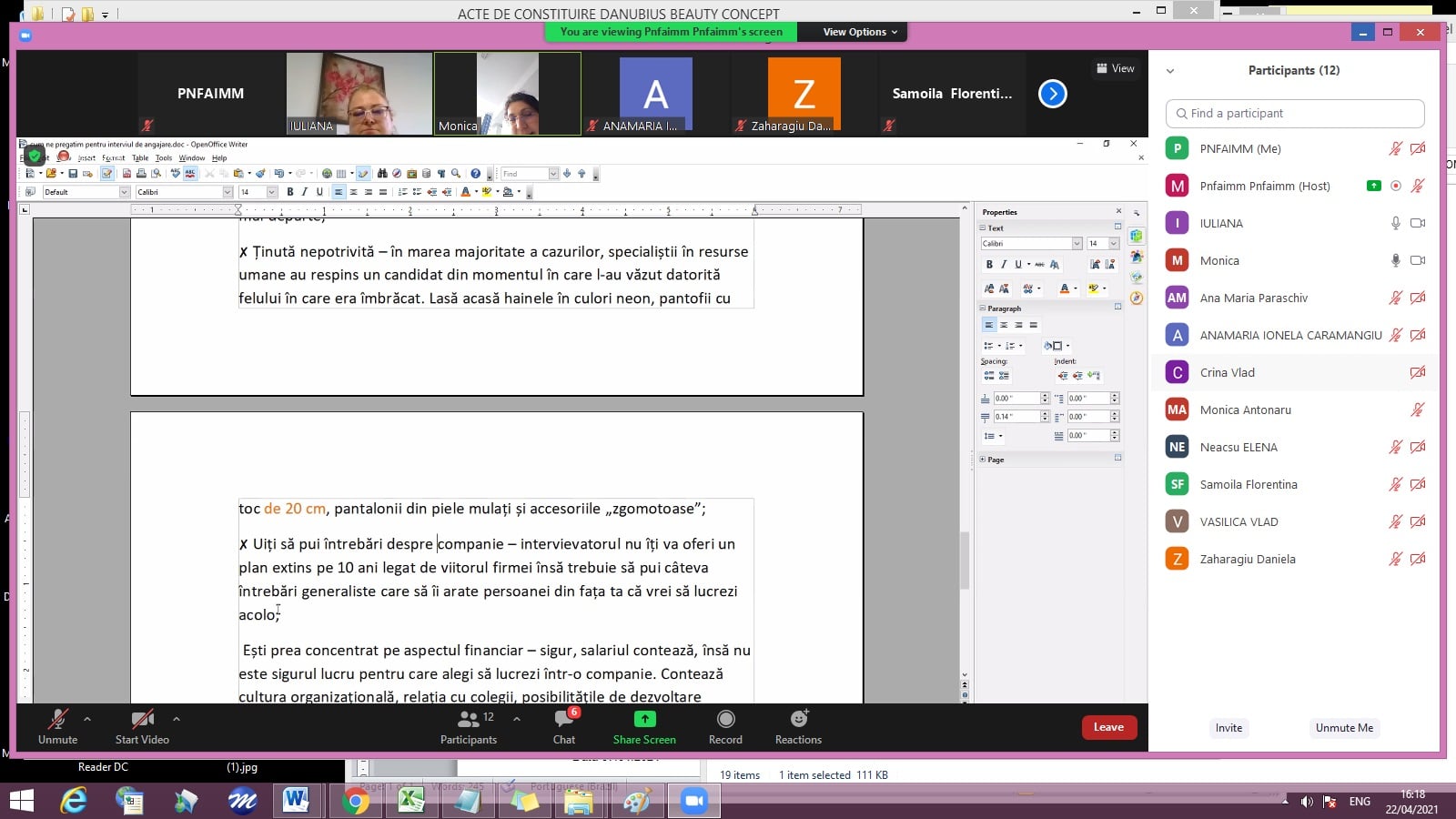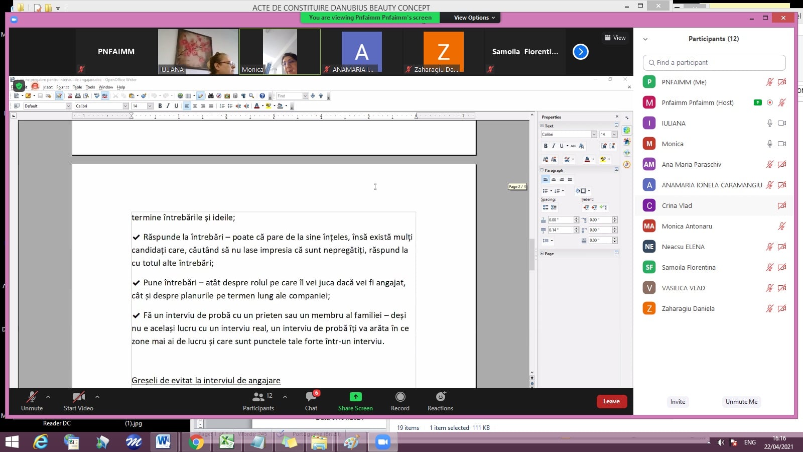 In data de 22.04.2021, a avut loc o intalnire, in cadrul platformei Zoom cu beneficiarii proiectului „Un viitor mai bun prin educatie” – elevii de la Scoala Profesioanala „Danubius” – si antreprenorii implicati in acest proiect. Astfel, s-au purtat discutii referitoare la modul in care ar trebui sa ne prezentam pentru un interviu de angajare, greseli de evitat si ce intrebari putem adresa angajatorului. De asemenea, s-au reluat discutiile referitoare la intocmirea documentelor necesare pentru infiintarea firmelor de exercitiu.