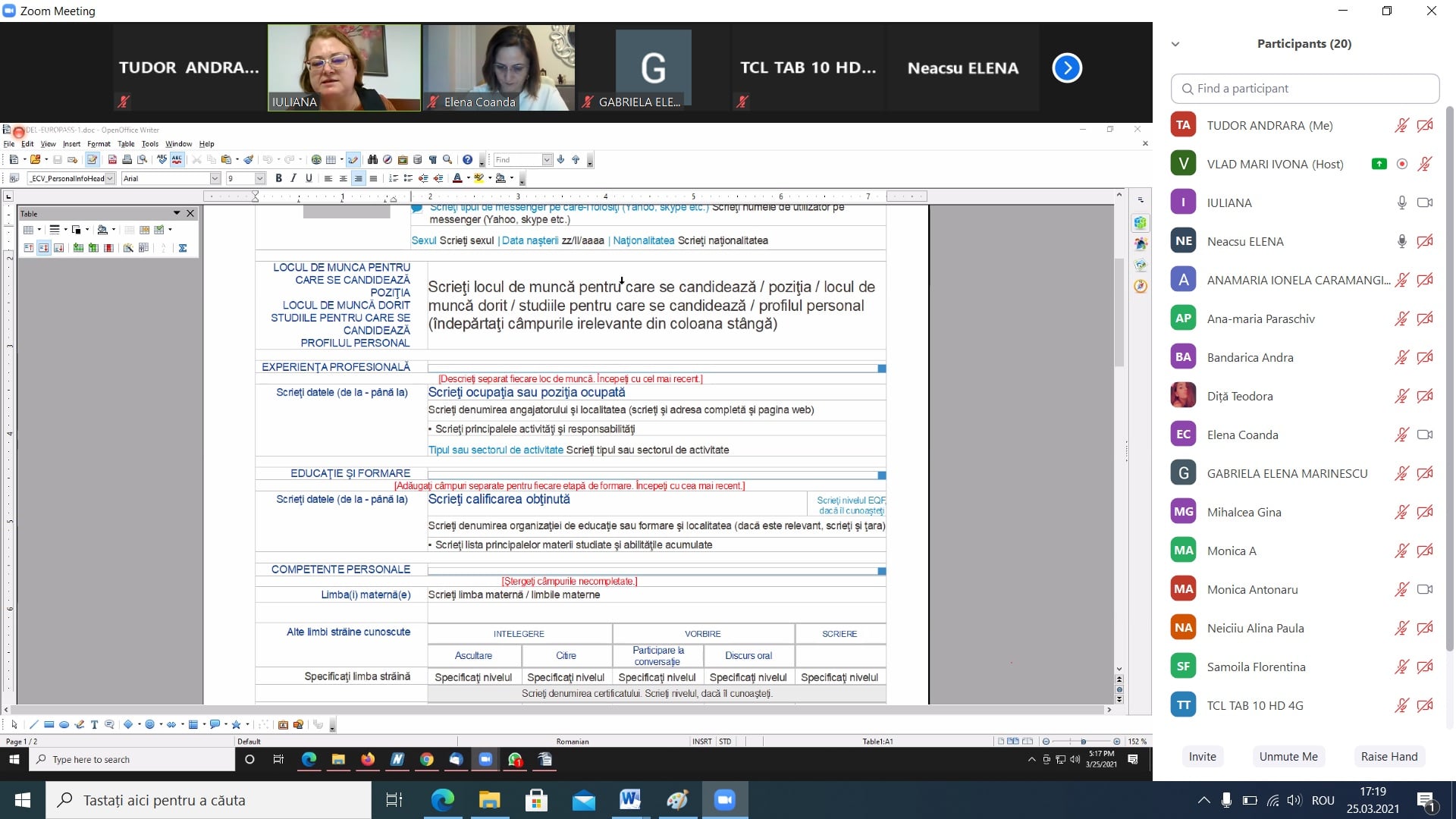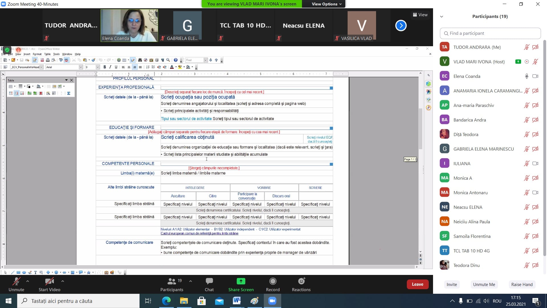 In cadrul platformei ZOOM, in data de 25.03.2021 si 26.03.2021 au avut loc doua sedinte cu elevii din cadrul Şcolii profesionale “Danubius” Tulcea, Liceul Tehnologic “Mihai Viteazul” si antreprenorii implicati in proiectul „Un viitor mai bun prin educatie”. In cadrul acestor sedinte s-au purtat discutii legate de scopul, importanta si pasii necesari in vederea realizarii unui CV si s-au reluat informatiile discutate in sedintele anterioare referitoare la firmele de exercitiu.